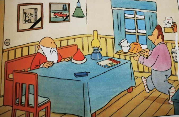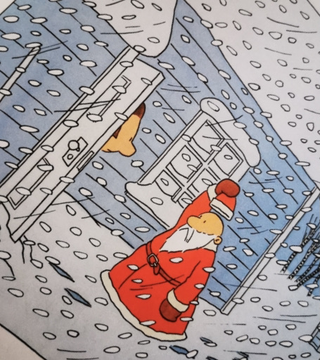 J’ai retrouvé ce joli conte où le Père Noël se trouve en grande difficulté le jour de le date fatidique, la veille de Noël. Ce soir-là, l’attelage des rennes se fracasse et il fautd’urgence le réparer. Demander de l’aide ? Mais, comment faire sans se dévoiler ? La solidarité des ouvriers va jouer un rôle primordial. Tout d’abord Elvis perturbé le jour de congé au moment où il voulait mettre en place son sapin de Noël. Mais il lui faudra aussi l’aide d’Ernest, puis d’Herbert et de sa charrette de foin pour nourrir les rennes affamés… Et hop ! le Père Noël va pouvoir commencer sa tournée avant minuit sans être reconnu, au grand soulagement de l’homme au manteau rouge. Sauf que… C’est joliment dessiné. Humour et gentillesse déclinent cette histoire, belle dans sa drôlerie et sa simplicité.